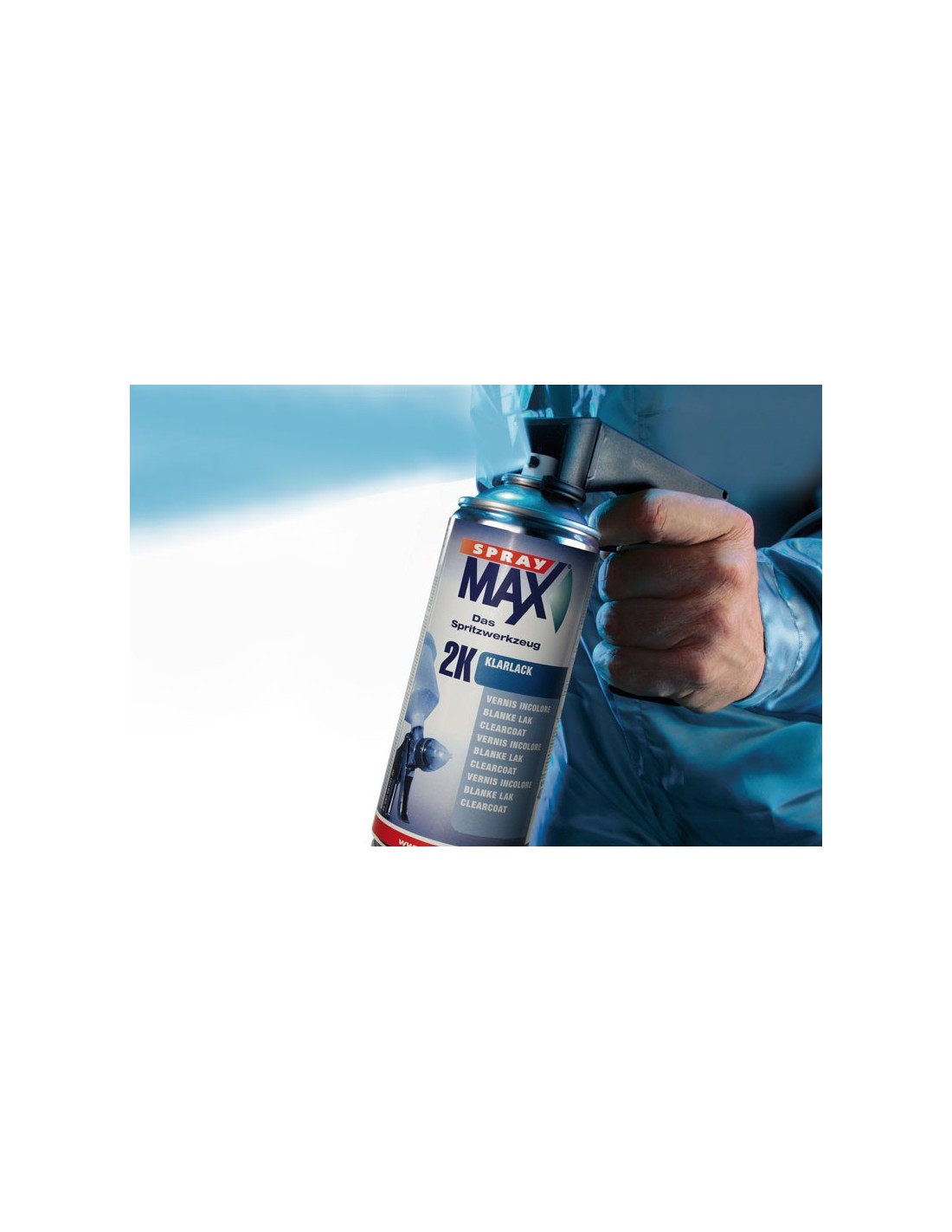 Spray paint-can aerosol hand-grip for simple and familiar handling while painting with SprayMax or other spray paint can products. The hand grip facilitates painting hard to access painting points such as the inside edges in the door entrance area.